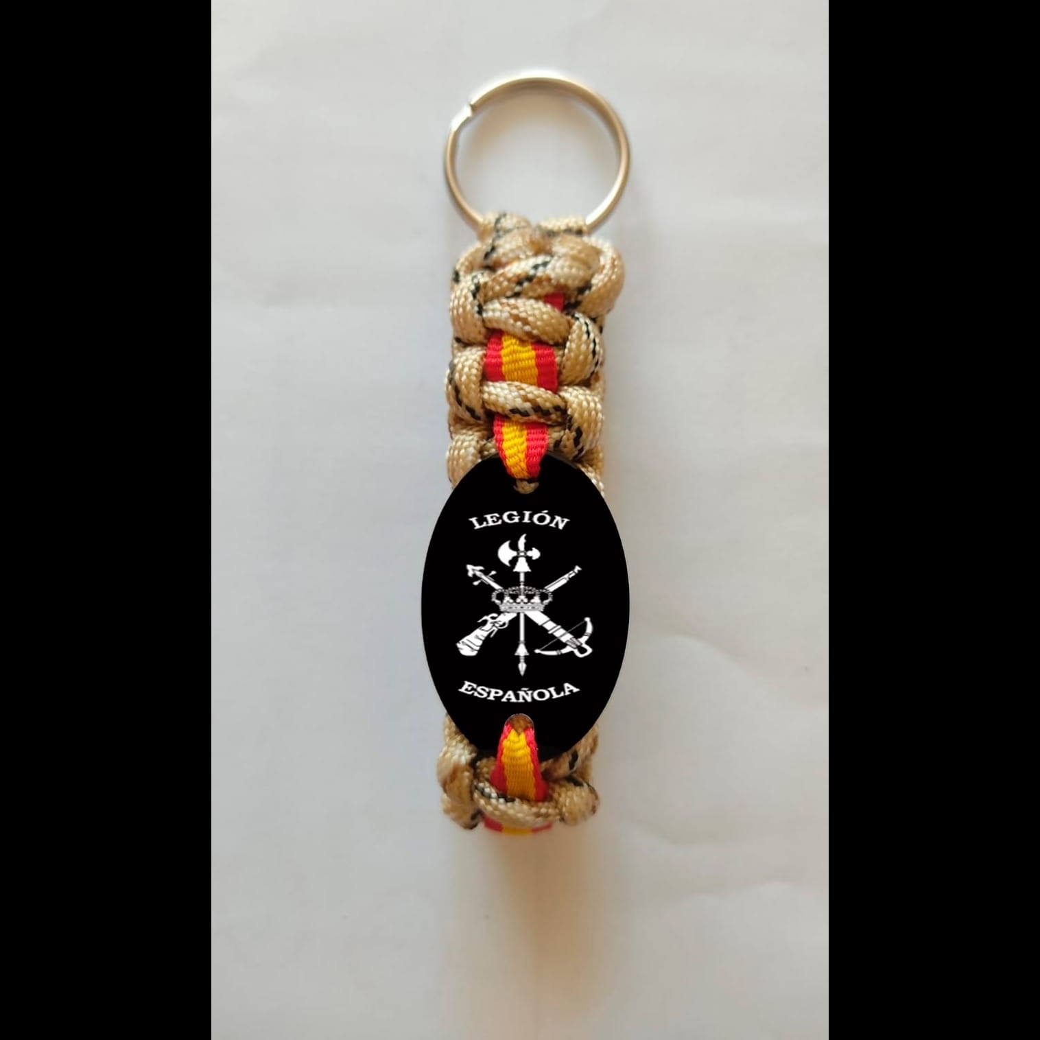 xclusivo llavero de la Legión Española, tejido en paracord de alta resistencia con los colores de la bandera nacional. Un símbolo de fuerza, honor y espíritu legionarios, diseñado para quienes llevan el orgullo de España siempre consigo."